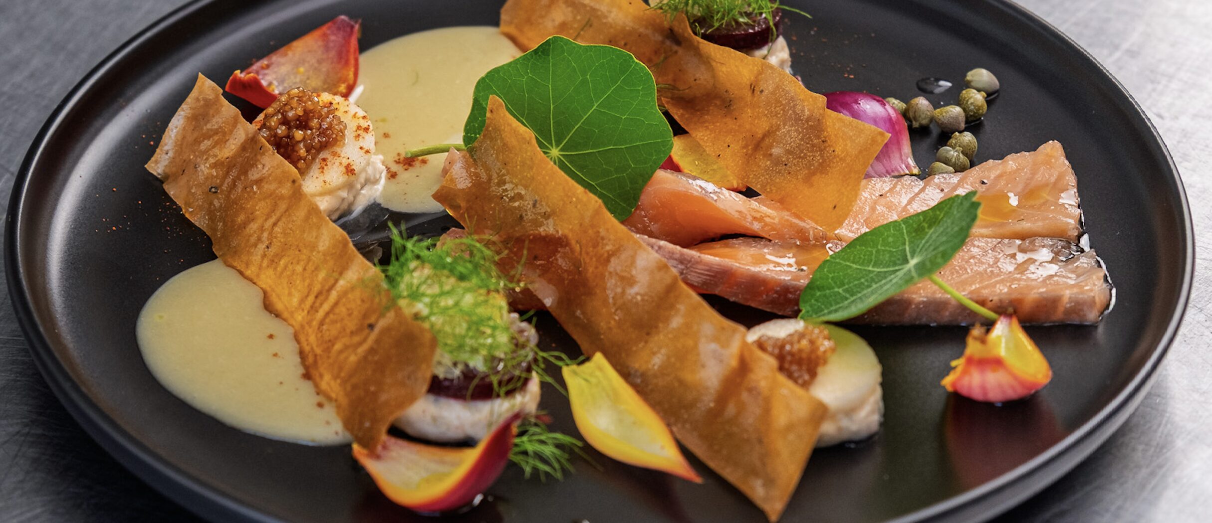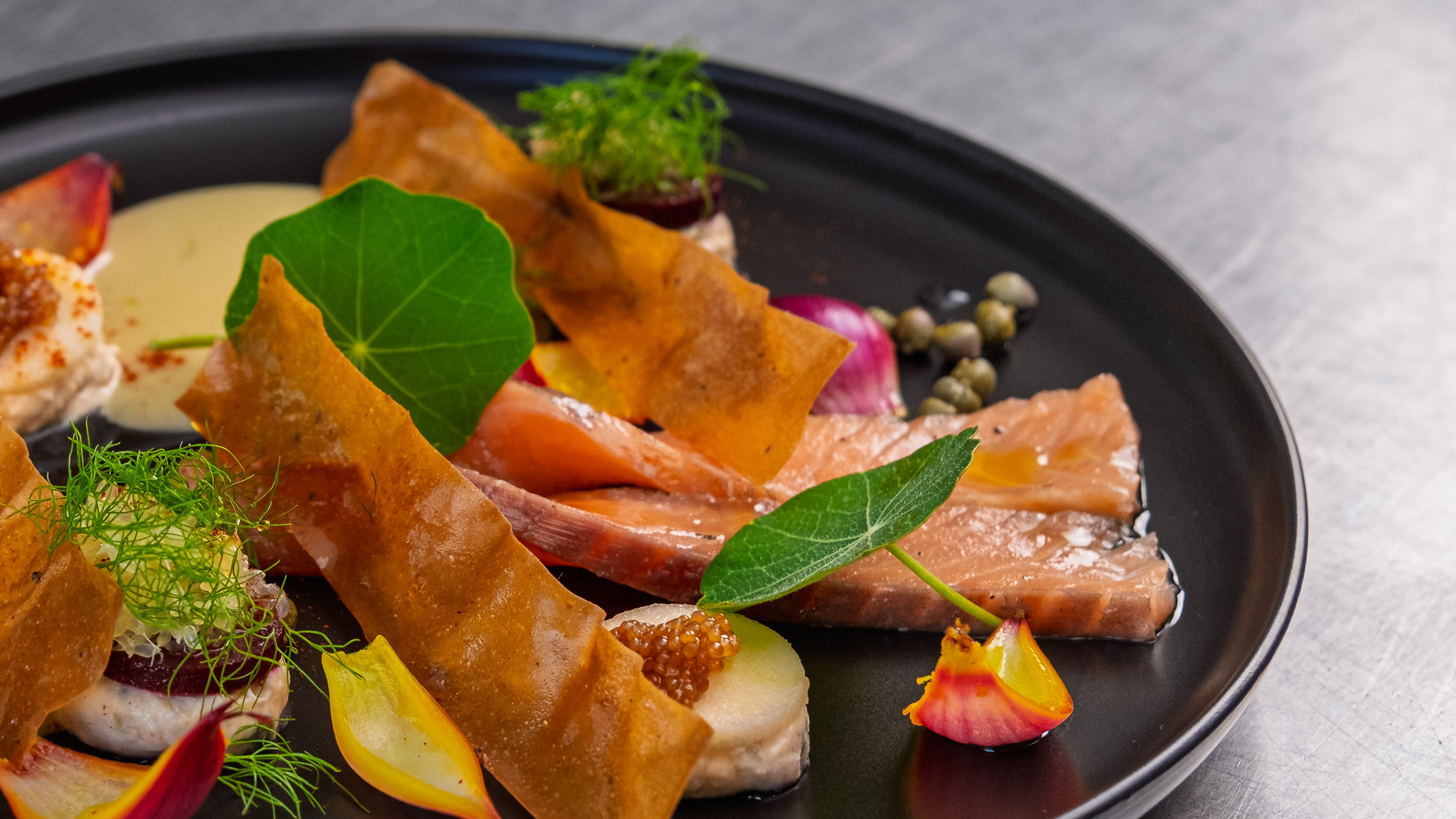 Cured Salmon with Crème Fraîche Mousse, Beetroot, Apple and Pickles