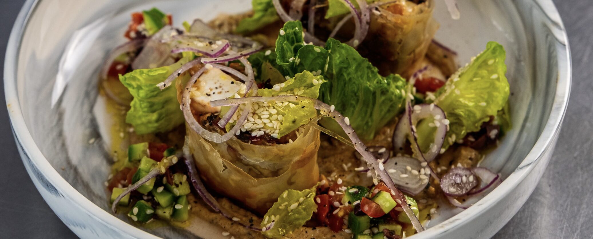 7. To serve, cut the phyllo tart in half to reveal the centre, place on a bed of puree and top with salsa. Add slices of fresh red onion and romaine lettuce. Sprinkle with toasted sesame seeds.