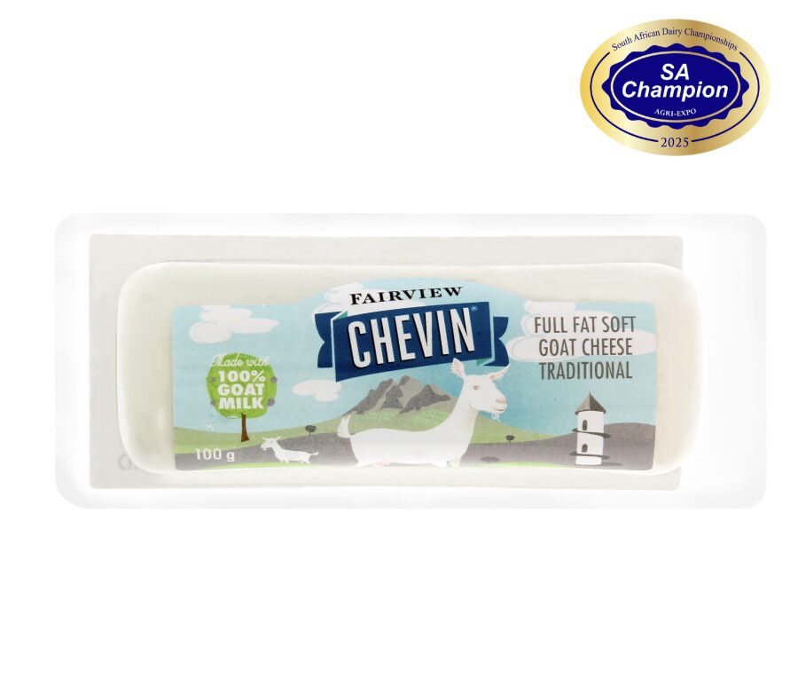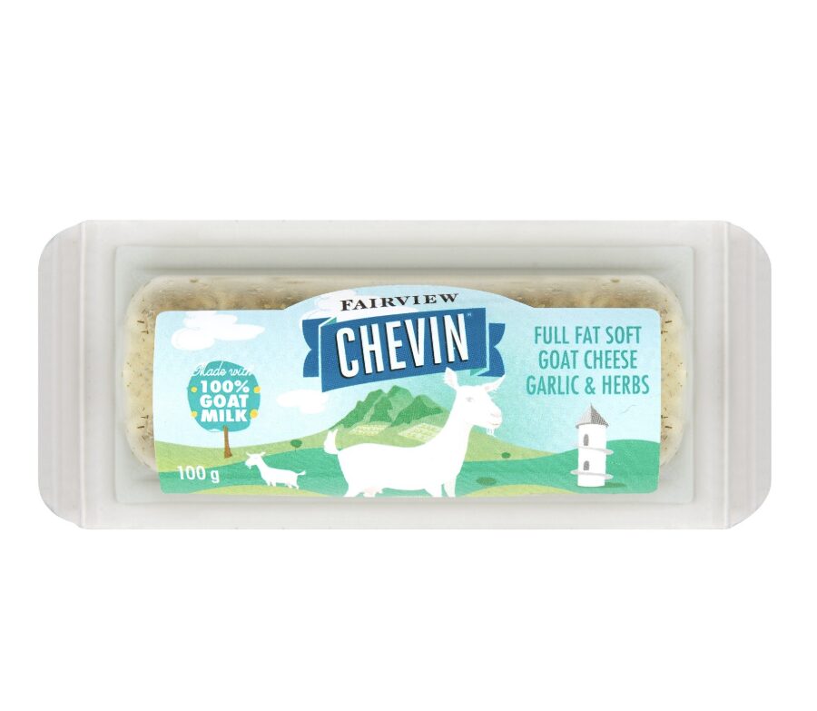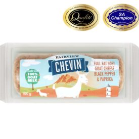 A soft, goat’s milk cheese with a characteristic flavour. Chevin is one of the first cheeses that was made at Fairview and is the most popular goat’s milk product. It is still made using the same traditional recipe, with the curd pressed in muslin bags to remove just the right amount of whey.